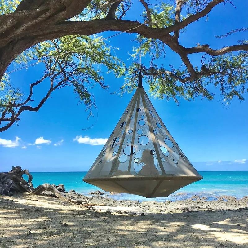 Airbnb 2019年3月数据显示,“冥想”类体验订购者的 YoY 增长高达367%。越来越多的人希望在旅途中回归自然、清心独处。这款半封闭式吊椅,可轻松隔离海滩喧嚣,透气孔的设计在保证通风的同时又不破坏私密性,是读书、小憩或冥想的理想空间。
