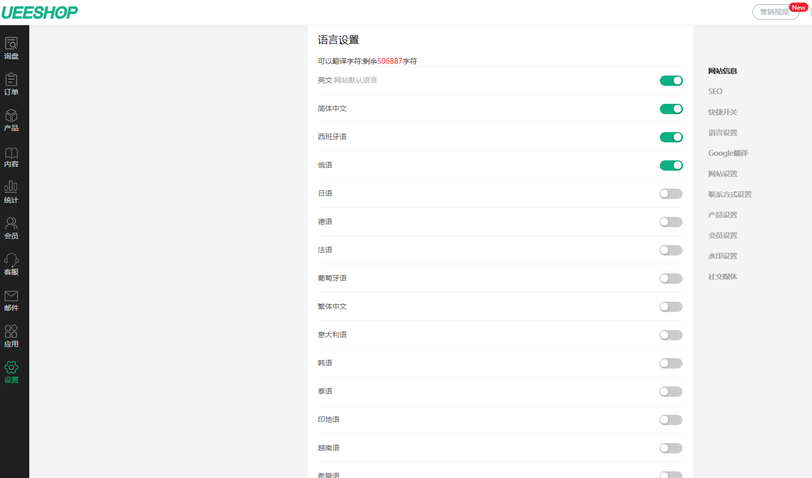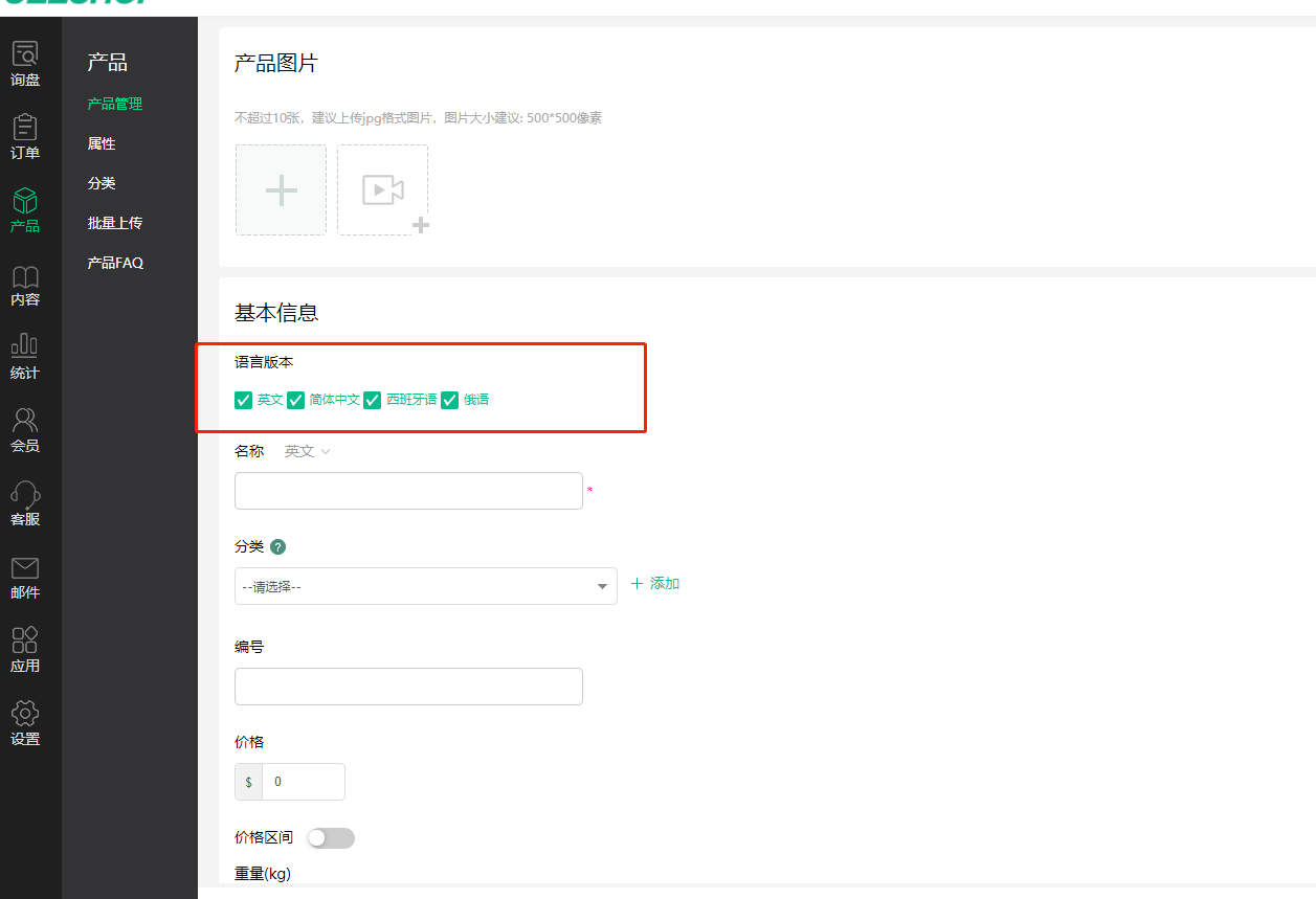 1.后台基本设置默认开启英文,批发版开通多语言版后,后台基本设置中会显示语言,默认关闭,开启后前端可显示开启的语言;