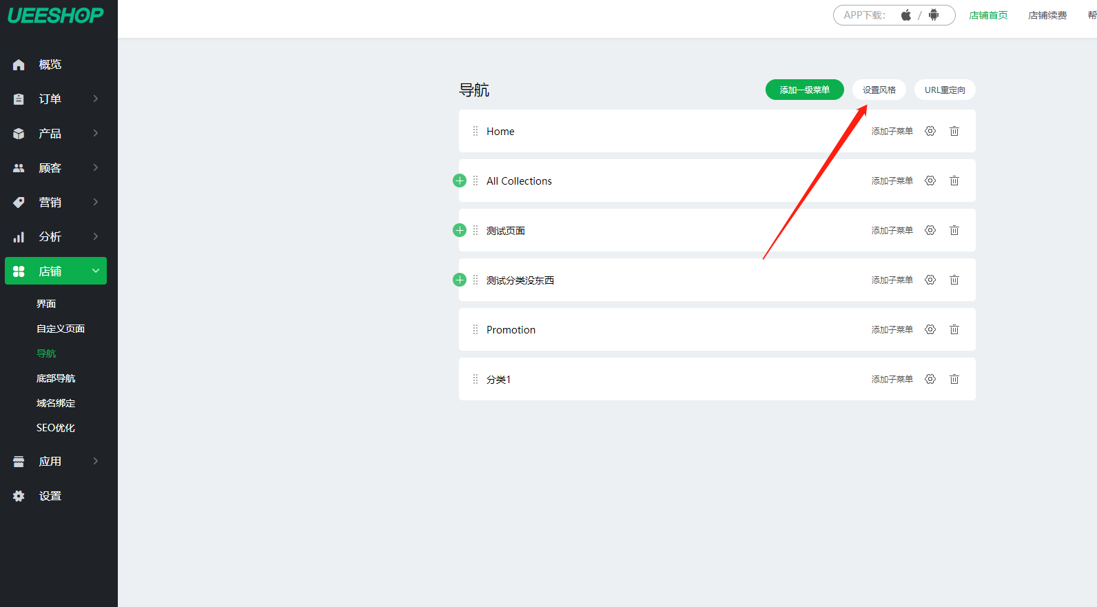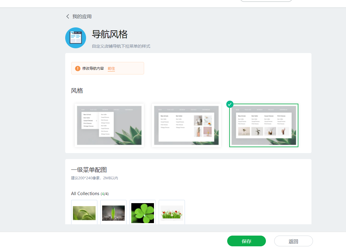 2.增加导航风格应用,后台店铺导航页面,点击“设置风格”功能,可跳转到导航风格页面,支持三种导航风格设置