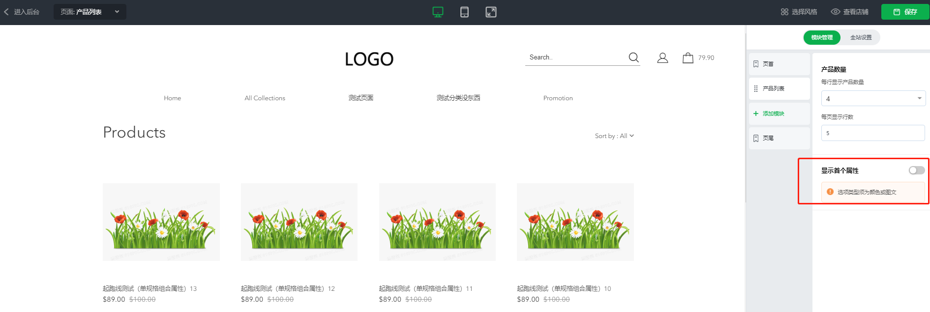 1.后台店铺装修,产品列表增加“显示首个属性”,可设置产品列表是否显示首个属性