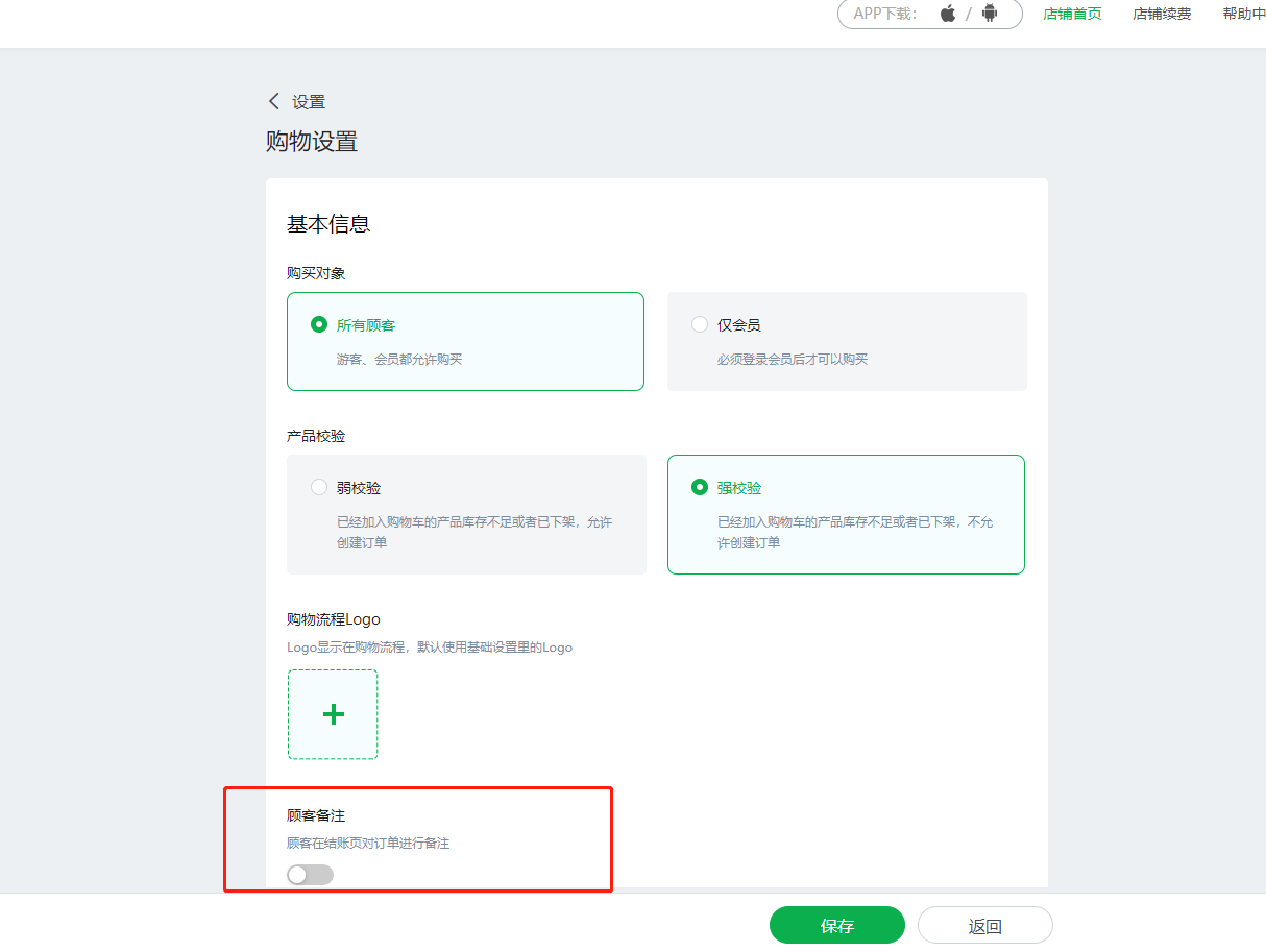 1.后台购物设置增加顾客留言开关