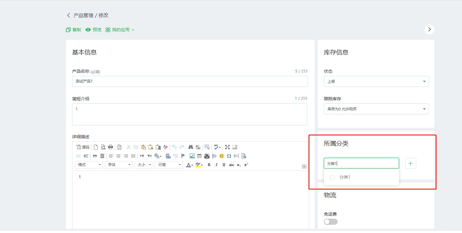 1.产品编辑页的所属分类,支持输入关键字匹配到对应的分类,再从匹配结果里面选择